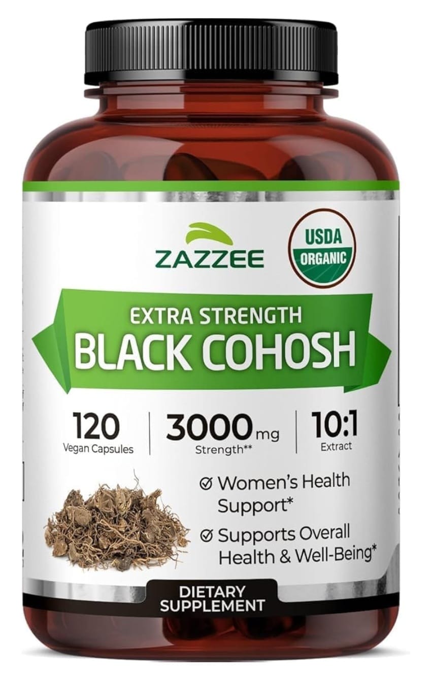 Black Cohosh supplement to support women during menopause by easing hot flashes, balancing hormones, and promoting overall comfort and wellness.